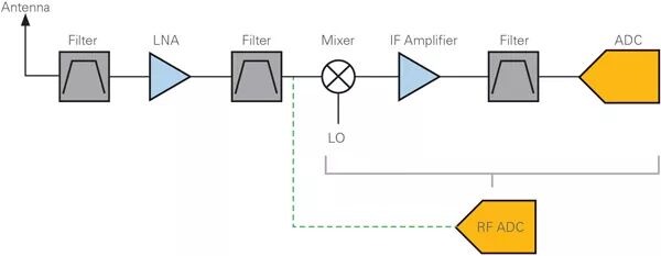 直接RF采样架构将彻底改变AESA雷达。在完全有源阵列中,每个天线元件都需要自己的ADC和DAC。这意味着如果ADC和DAC无法直接以雷达的工作频率进行采样,则每个发送- 接收模块(TRM)需要有一级进行上/下变频。这会增加设计成本、尺寸和性能变化。而使用直接RF采样架构,就无需再使用混频器和本地振荡器(LO),从而简化了RF前端架构,降低成本、尺寸和复杂性。基于如此大量的发射器和接收器,直接RF采样架构将可以显着提高通道密度并降低每个通道的成本。